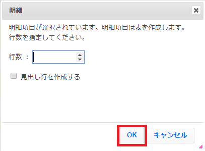 作成する表の行数を入力して、[OK]をクリックしてください。