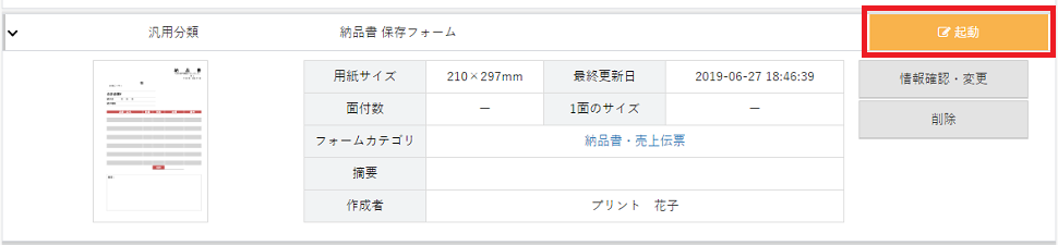 ヘッダーメニュー内「フォーム 一覧>保存フォーム 一覧」ページを開き、編集したい保存フォームの[起動]ボタンをクリックします。