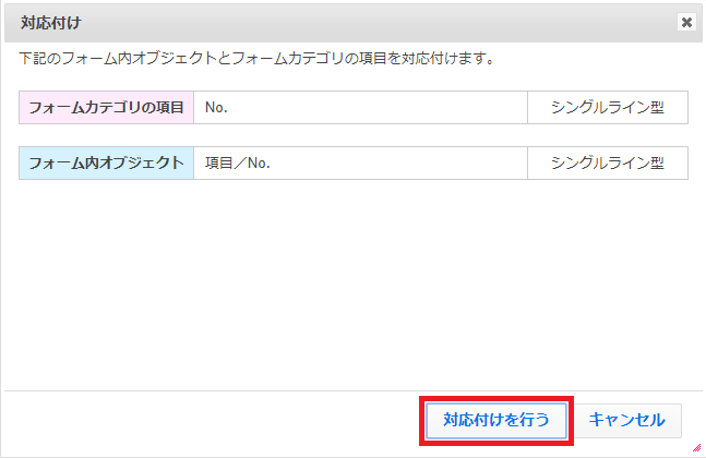 対応付ける[フォーム内オブジェクト]と[フォームカテゴリの項目]を選択して、[対応付け]ボタンをクリックします。